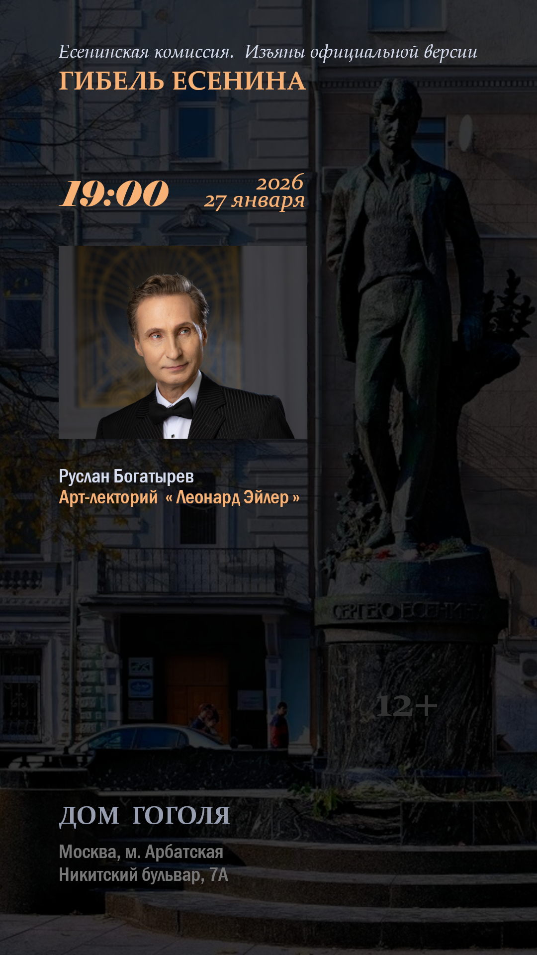 Руслан Богатырев, руководитель научного проекта «Гибель Есенина», директор Европейского центра программирования им. Леонарда Эйлера, в этой лекции представит первые результаты работы своего коллектива.